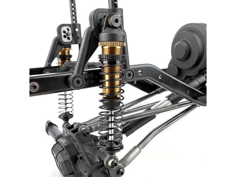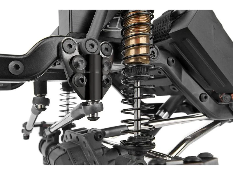 We’ve updated the Builder’s Kit 2 by including our GKSTM shock towers in front and rear. Our shock mount inserts provide the ability to adjust shock angle, droop, and vehicle ride height without affecting spring preload. Matched up with the shock mount inserts are our race-proven, ultra-smooth Factory TeamTM bronze shocks with black caps and collars–perfect for traversing rough terrain. Along with the updated shock towers, we’ve included the GKS aluminum track bar mount that is bolted directly to the frame rails. This makes the front suspension more rigid and flex-free with a more precise steering feel. Also included are updated Factory Team 12.3-inch wheelbase high-clearance links with black nitrate finish and low-friction Delrin(R) pivot balls, which are more resistant to abrasion and friction wear.