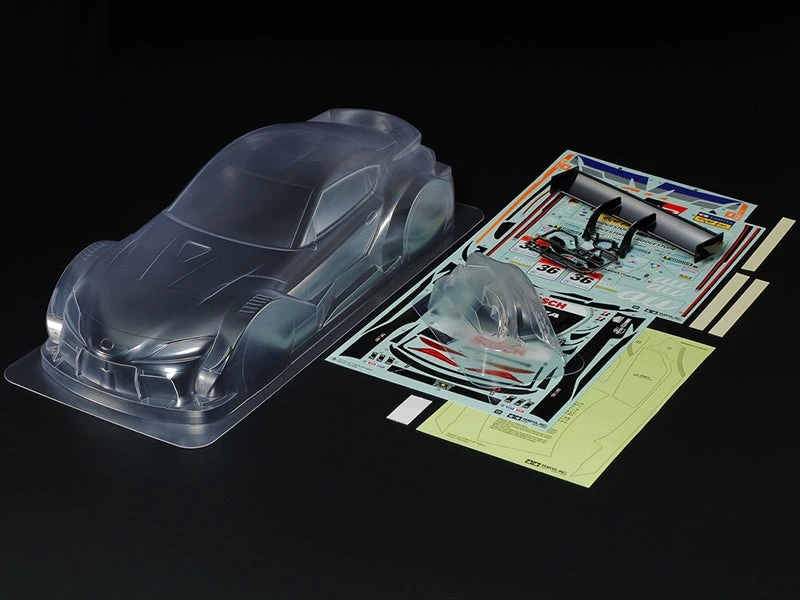 This is a clear polycarbonate body parts set of the au TOM’s GR Supra. It is made out of 1mm thick polycarbonate. The set includes masking seals for the windows and a sticker set to finish the GT race car.